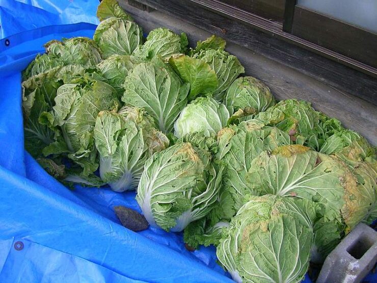 いよいよ収穫。 収穫した白菜は、保存用と漬物用にします。 保存用は新聞紙にくるんで家の中に置けば春まで持ちますから、ツナサラダ・野菜炒め・鍋・味噌汁・ラーメンのトッピングになります・・・うまいです。 ただ収穫時に肥料が多く残っていると、春まで持たずに腐り始めます。 肥料を早めに切る → 「味が良くなる、保存性が上がる」。 おいしい野菜を食べるためには、肥料を切るタイミングはとても重要です。 漬物は夏まで持ちます。 酸っぱくなった理想白菜を台湾系の料理で食べるのもおいしいです。