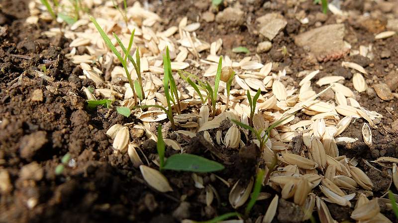 種への事前吸水は必要ありません(吸水してると蒔きにくいですし)。 - 土と籾殻でカバー する。
