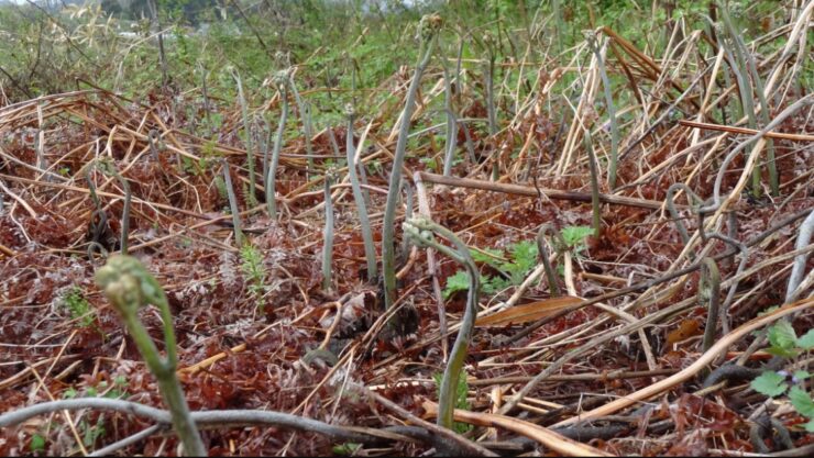 もし葛が出てきたら、ワラビの葉が落ちるのを待って(冬の初め)、グリホサートをかけてやれば良いです(葛はワラビより遅くまで元気なので、葛だけを枯らすチャンスです)。