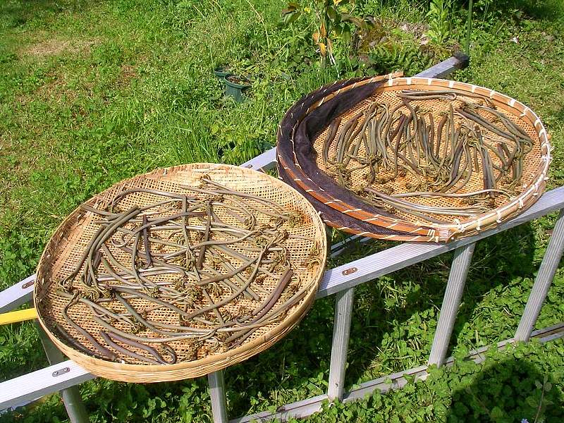 天日に当てると、直ぐに茶色くなってしまいます。更に3日ほど干すと真っ黒になり完成です。