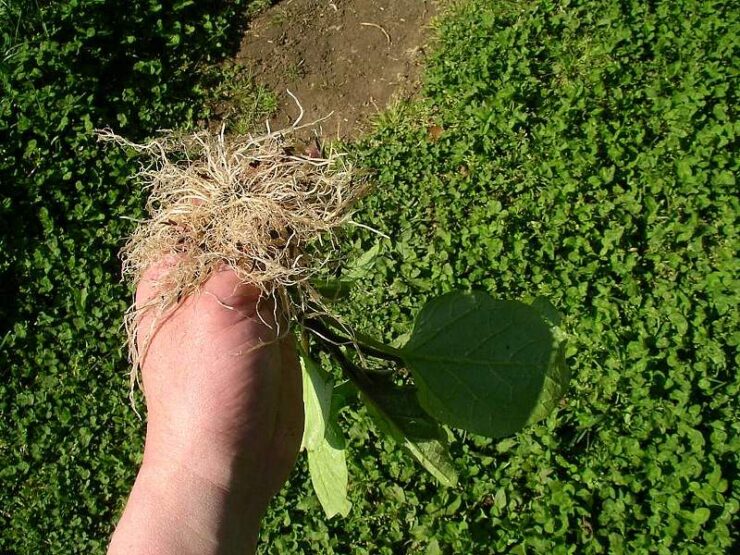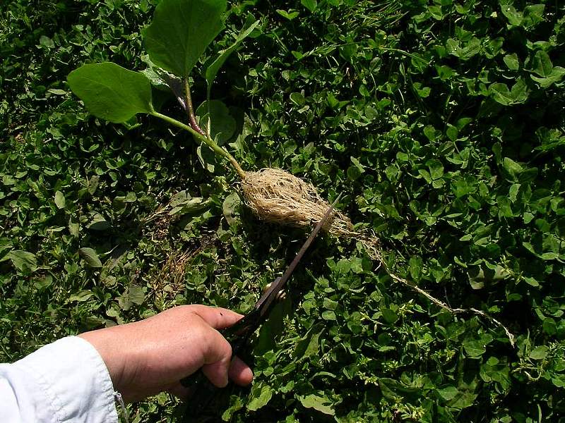 普通はポットから苗をスポッと出して、そのまま植える。 今回は苗の根っこを洗って土を全部落とし、更に根を1/3程切っちゃう。 え~!本気? ※「根鉢を崩さないで植えて下さい」が普通です。 根っこを切った苗を根を広げて植え付ける。 こうすると畑の土と早く馴染むそうです。 もしこれが本当なら、ホームセンターの大苗でも秋まで持つんじゃないだろうか?