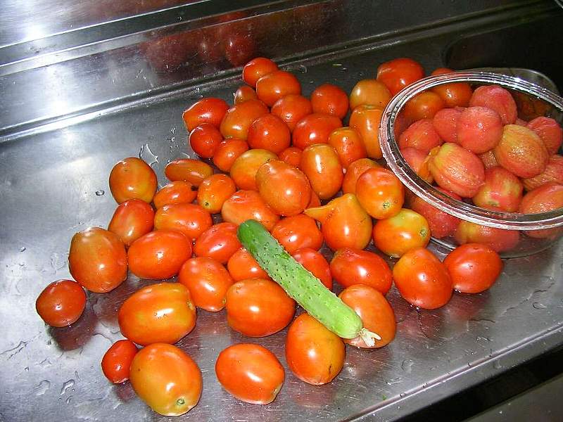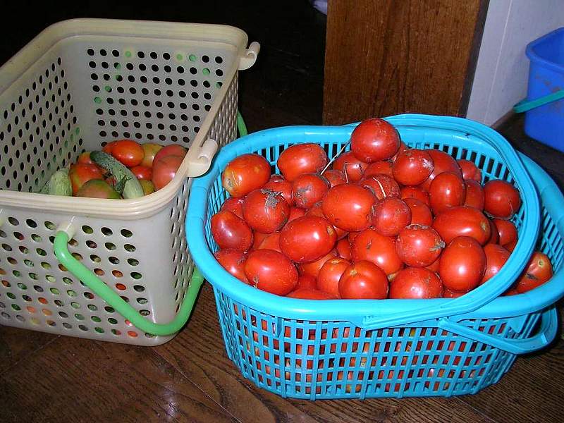 8/21 にたきこまの収穫がそろそろ終わり。 やっぱりもの凄い収穫量です。 こんだけ多いとさすがに飽きます。 アイコや桃太郎はまだまだこれからって感じ。 にたきこまは「早期大量収穫」です。 全部瓶詰めにしました。 1.5L瓶で20本、約30Lの収穫でした。