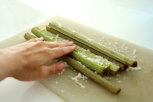まな板に秋田フキを並べて塩を振りごろごろ転がします。 - 鍋にたっぷりの湯を沸かし、塩が付いたままの秋田フキを入れる。