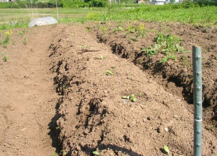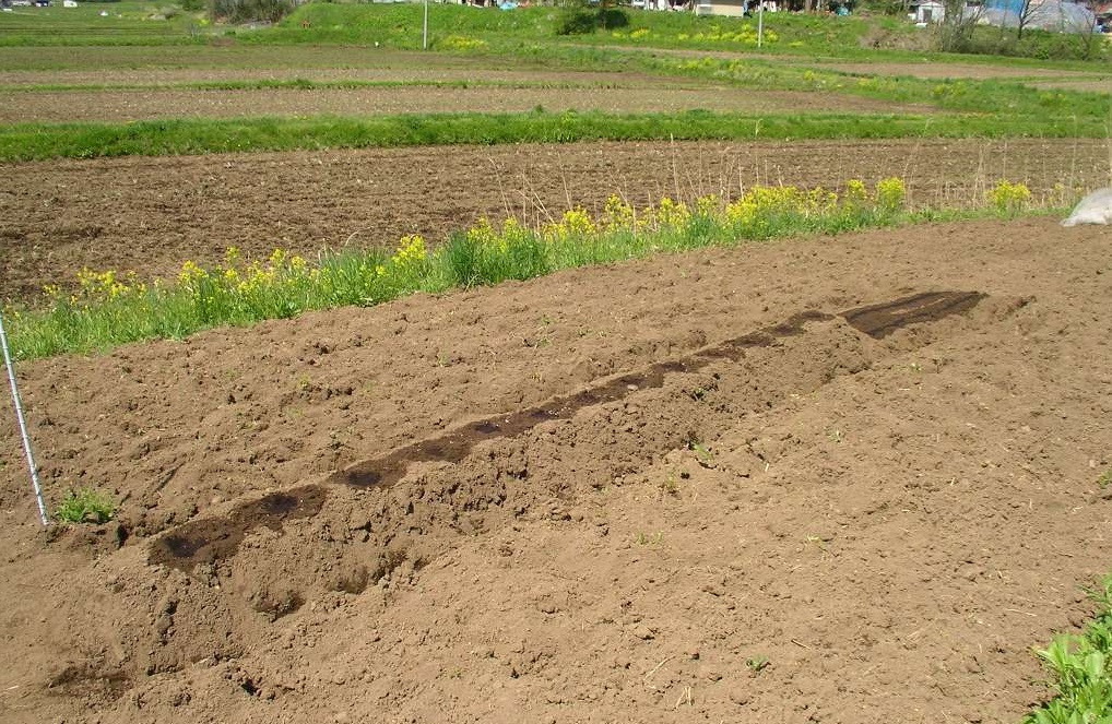 栽培期間が長いの牛糞堆肥を大量に使い、畝を少し高くします。
