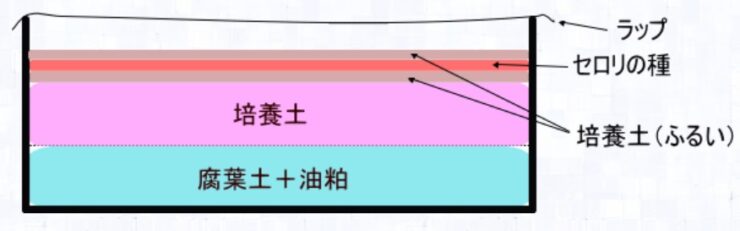 セロリは発根が弱々しいので、根が入りやすくするため。 - セロリの種を均一に多めに蒔く。