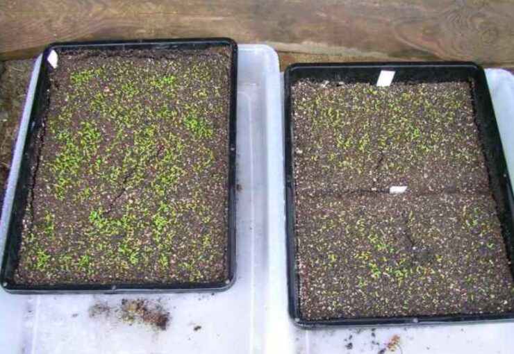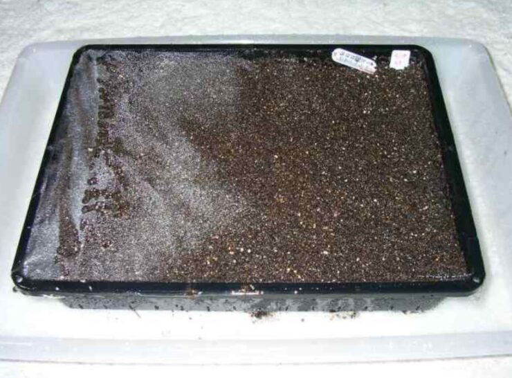 - 育苗箱に腐葉土と一握りの油粕を混ぜた物を半分ほど敷く。