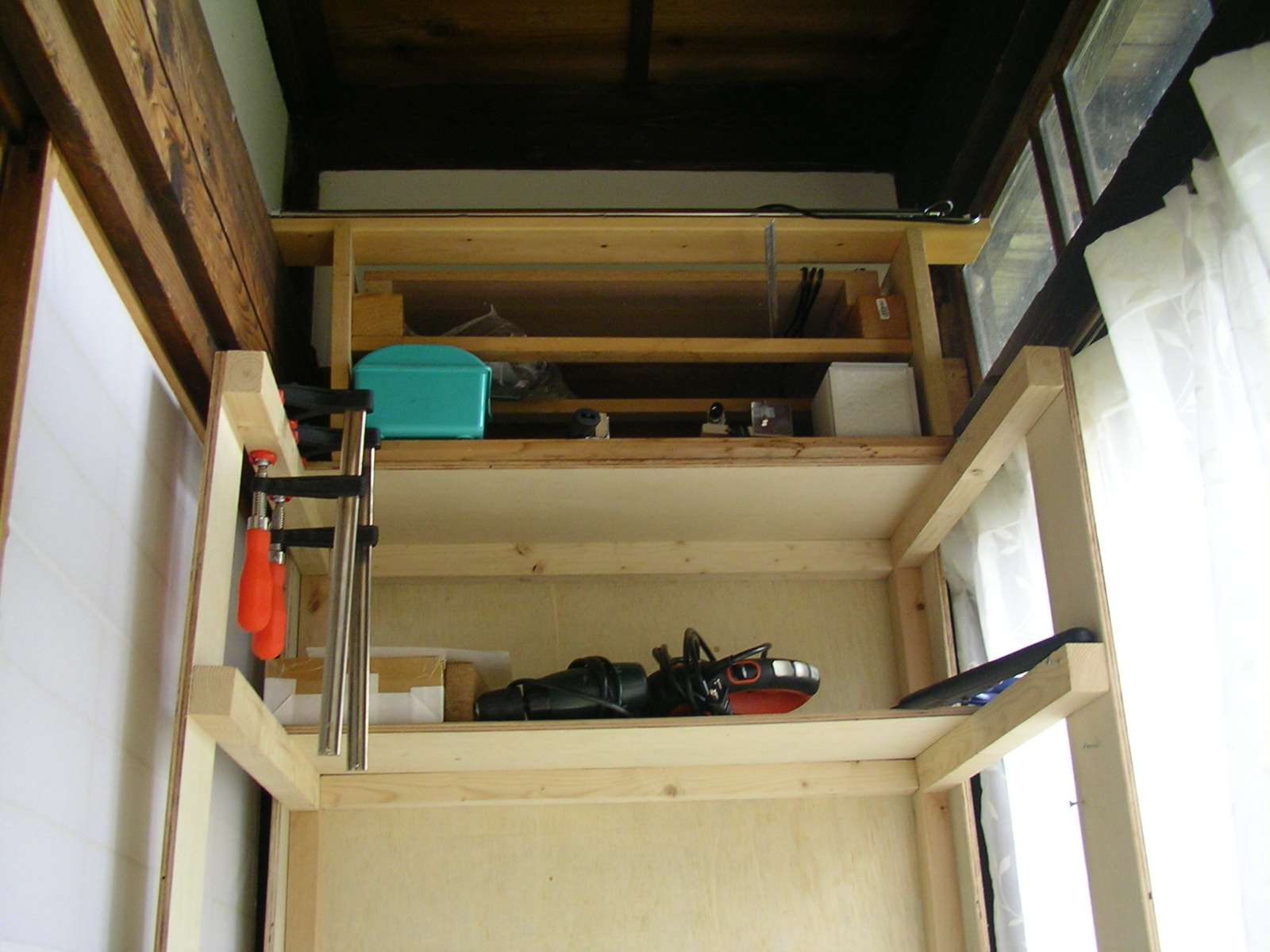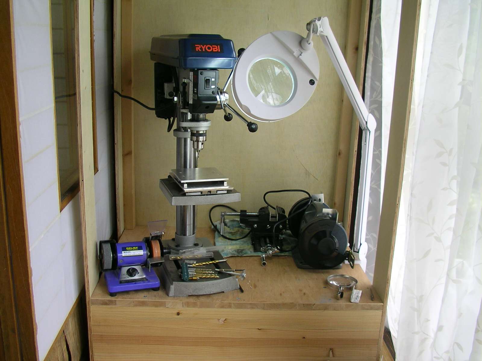 リョービの卓上型で2万5千円(今は京セラが扱ってます)。 もっと安いのもあるんだけど、簡易フライス作業もしたいんで、軸の太いこれを買ってみた。 ボール盤よりもテーブルが立派(^^; ホムセンで20cm角の端材を売ってたので、4本を重ねて組み合わせてテーブルにした・・・重くてビクともしません。 廊下の一番奥が作業場に変身です(古民家は空いてる場所なら幾らでもある)。 |