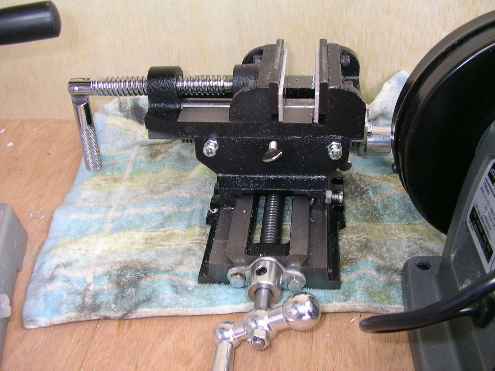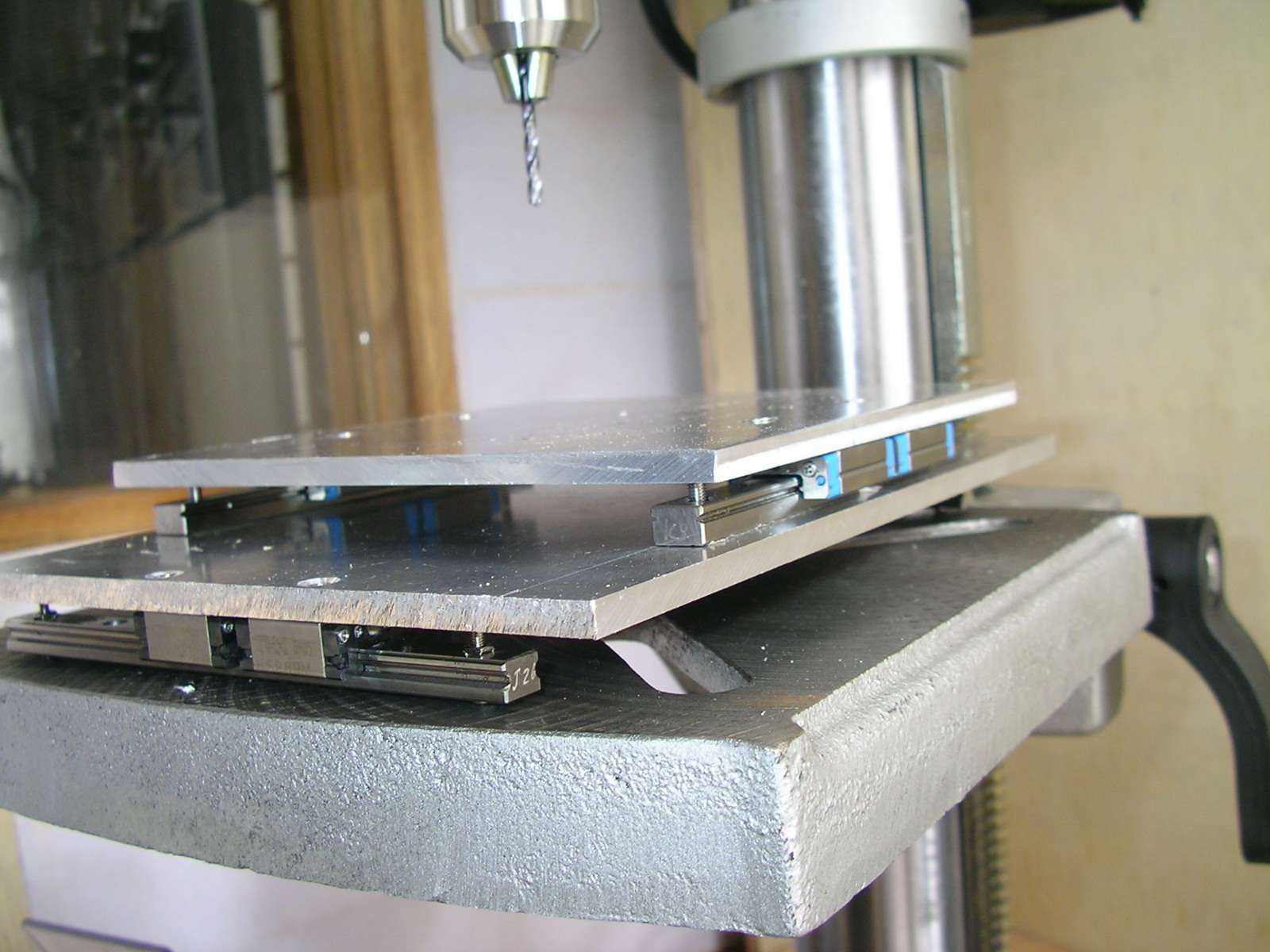 普段の穴あけではこいつを使ってます。 5mmアルミ板にリニアガイドをクロスに取り付けたもの。 前後左右自由にスライドするんで、ポンチ穴にドリルの刃が吸い込まれるように動いて、正確な位置に穴が開くってわけ。 リニアガイドはヤフオクで落札した中古品。 |