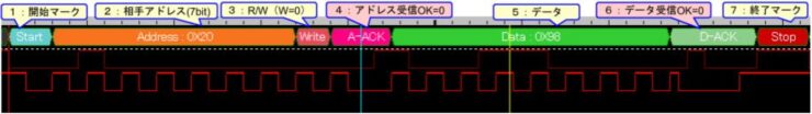 相手(スレーブ)のアドレスだけど、ソフトでは左に1bitシフトして出す。例えば0x20の相手にデータを渡したいなら0x40を出力するってことだ。