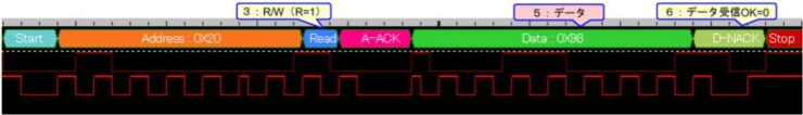 データの受取完了&終わりって意味で、マスターがNACKを出した(複数バイトの受信のときはここでACKを出し、最後のデータを受信したらNACKを出す).