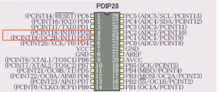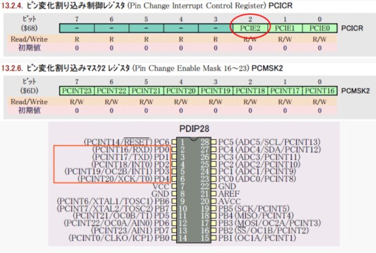 mega328では、INT0~1とPCINT0~20の割込みがあるが、INTはPIN別+優先順位高、PCINTは8PIN分まとめて発生し優先順位が低い。