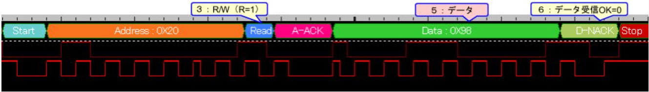 dat = i2c_readNak();   // このデータは最終データとなるので、スレーブへの応答は"NACK"