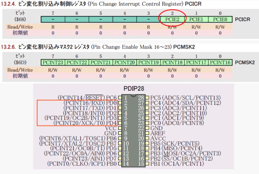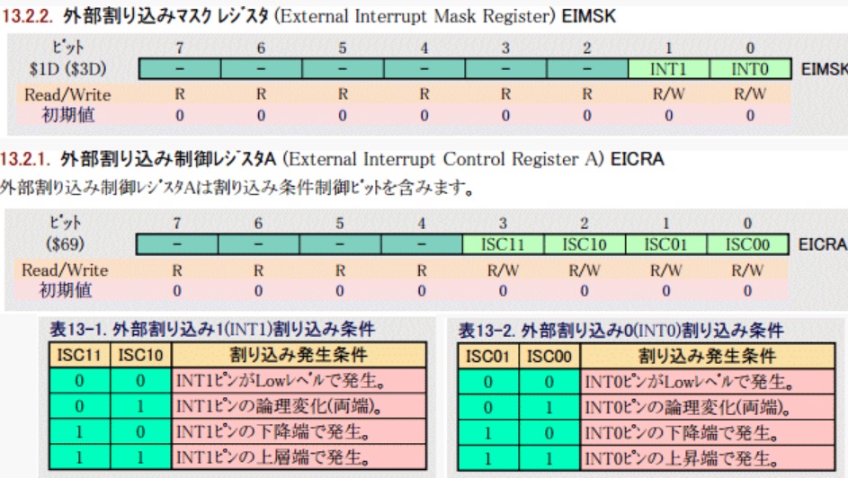 検索文字列としては INTでは EICRA/EIMSK 、PCINTでは PCICR/PCMSK 、その他 sei() cli() ISR などだ。