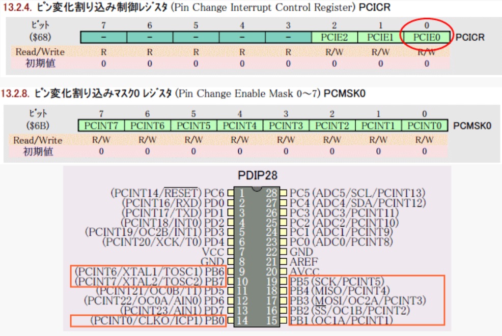 なおPCINTはレベル変化で割り込みが発生するので、ISR関数内でポートを読んで処理を決めてやるこっちゃ。