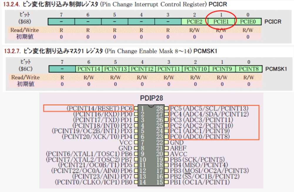 sbi(PCMSK1, PCINT8);   // PCINT8のマスクを解除