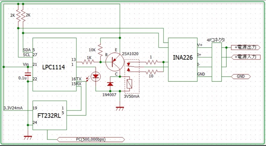 微少電流計(RL78版) 改めてINA226で作ってみた。 ちょい仕事の方でバッテリー駆動の製品を作っていて、これの間欠動作時の消費電流をグラフで見たいんで作ることにした(貧乏人なんで電流プローブを買えない)。 んでRL78に移植するのが面倒なんでLPC1114で作っちゃった。 ハード どれも仕事で余った手持ちの部品なんでやっつけです(計測する電流が小さいので、全体的に細い線を使ってる)。 このINA226のシャント抵抗を外して、1Ωと10Ωのシャント抵抗(3Wで1%誤差)をくっつけた。 こちらは高級品の金属箔抵抗 1Ω0.3W:誤差0.5% 15ppm/°C OLINAS 10Ω0.3W:誤差0.1% 5ppm/°C OLINAS もっと精度が必要ならINA226のVSに電圧リファレンスICの出力を使うとか? で、抵抗の切り替えにリレーを入れてみた。これでパソコン側から抵抗を切り替えられるんで便利じゃん。うむ~こんな素晴らしいアイデア見たことない(^^; ところでINA226はAliExpressなら$1程度で売ってるんで、時間があるならこれで良いかも。 USBCDC部分は秋月の例のFT232RLを使い、3.3V電源もここから貰ってる。 この3.3V電源はFT232内蔵のレギュレータからの出力で、秋月の資料にはMAX24mAとか書いてあったと思うけど本家の資料には50mAと書いてあるような?んま、リレーを50mAで動かしても平気みたいなんで気にしないって事で・・・仕事じゃないし(^^;