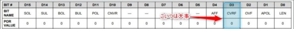 <レジスタ6> それと割と大事なのがこれ。 要するにAD変換終了フラグみたいなものらしいんで、これが「1」になったら電圧を読み出すようにする。「1」になる前に読み出しても前回と同じ値なんで無駄みたいよ。 ※なおALARMピンに変換終了の結果を出すことも出来るみたいなんで、CPUで変換終了割込みを使いたいならCNVR(D10)をセットしておくみたいだ(試してない)