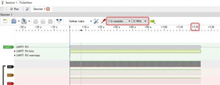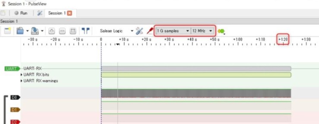 12MHzで1G個のサンプリングを実行してみた。 1分20秒を越えるサンプリングを行える(最大は1T個のサンプリングが可能)。 本体側はタイマーでGPIOを読むだけで、そのポート値をUSBで片っ端からPCに送信してるだけなのかも。 PC側のアプリではポート値をため込んでおき、一杯になったら停止・・・そんな動作をしてる雰囲気。 長時間のサンプリングと解析には向いてそうだ。なにか使い途が有ると思う。 ※組合せによっては怪しい動きをするし、たまにタスクマネージャーのお世話にもなることもあり。