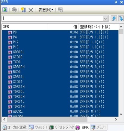 CS+内でデバッグ時、ポート値はSFRウインドウに、レジスタ値はCPUレジスタ・ウインドウに表示される。