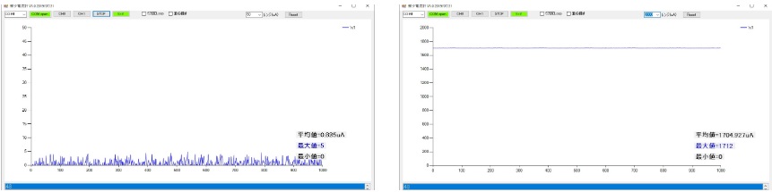 左:CH0の入力をショートしても±5μA程度のノイズが出る。右:大きめの電流を流せば目立たないけどね。