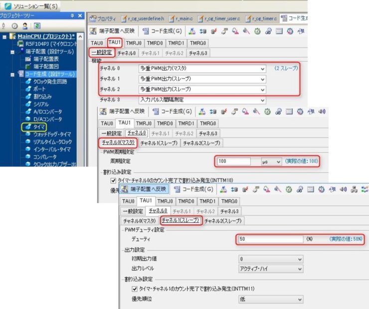 2016/10/23 RL78ではPWMをするときにタイマを最低でも二つ使う。一つはマスターと呼び、こいつはPWM周波数を決める。もう一つはスレーブと呼び、こいつはPWMのデューティーを決める。 スレーブは複数有っても構わなくて、複数有れば複数のデューティーのPWMを同時に出力可能だ(マスターは一個だけなので周波数は同じになる)。 今回はマスター一個にスレーブ二個で試した。つまりタイマを3個使う。 マスター:TAU1のチャンネル0 スレーブ:TAU1のチャンネル1と2 コード生成でこんな感じで設定した(スレーブのチャンネル2はデューティーを10%にしてる)。割込みは使わないけど、実験用に発生させることにした。