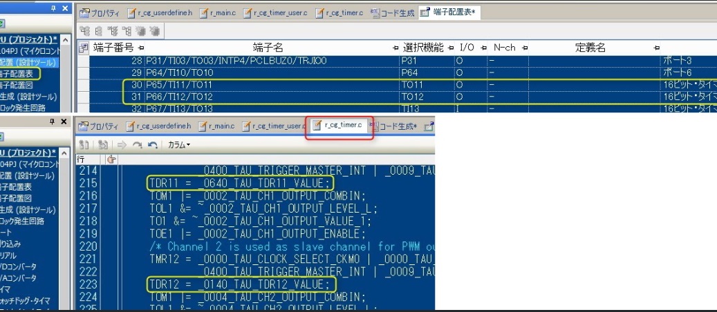 んで端子配置表へ反映させると、TO11とTO12が端子配置される。 更にコード生成させると”R_TAU1_Create()"にそれなりのコードが出力される。このコードの中で大事なのはデューティーを決めるレジスタとその値だ。 なんとなくわざとらしい数値がある(0640と0140)んで、これをいじってデューティーが変わるか調べれば良い。