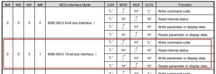 2016/10/29 参考HP データシート グラフィックLCDを使うことになった。LCDを直接操作するわけじゃなくて、コントローラICのILI9341(ILI9340でも動くと思う)のいじり方。 ・RL78と9341は16bitのパラレルで接続してる。 ・リセットはハード的に発生してる。 ってことで、あちこちググり回って見付けたのが上記の参考HP。 とても分かりやすく、更にソースも載せてくれてるんでいたって簡単に完成した。有り難うございます。 ところでどのHPもCPUと9341をSPIで接続してるけど、今回は16bitパラレル接続(P7/8)なんで、IO部分だけを修正すれば動くはずと目星を付けて作ったのがこれ。 要するにSPIで出力してるのをポート出力に変更しただけ。 ・IM0~3を0001にセットすることで16bitバスになる(9341マニュアルより抜粋)。 ・またレジスタへのアクセスは8bit幅だけど、GRAMは16bit幅でアクセスすることが読み取れる。