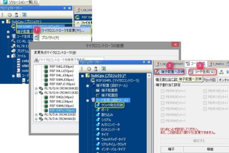 2016/10/21 追記 解決法を見付けた。 試したのはR5F104PJとPL(同じピン数でROM/RAMサイズが異なるCPU)。 ①「マイクロコントローラを変更」でCPUを変更する。この時点で端子配置表はクリアされるが・・・ ②続いてクロック発生回路とかを選んで、そこで「端子配置へ反映」をクリックする。 これで端子配置表が復活する。なんと!ただし端子配置表に自分で書いておいた定義名部分は復活しない(消えたまんま)。 事前に配置表をエクセル形式で出力しておけば少しは助かる。 ③続いて「コード生成」をクリックする。 これで変更したCPU用のコードが新たに生成される。 ただこのやり方は正式じゃない。ヘルプの「2.4.14 マイクロコントローラを変更する」の備考4にも引き継がれないと書いてある。 ま、動いてるから良いや。 しかしこの中途半端なツール。 コード生成を作成してる部署と、端子配置表を作成してる部署が異なり、これをまとめる人が居ないとかそんな感じ・・・お役所? ちなみに端子配置表でIOを変更しても、コード生成側には反映されないから気を付けてね・・・なんちゅう仕様じゃ。