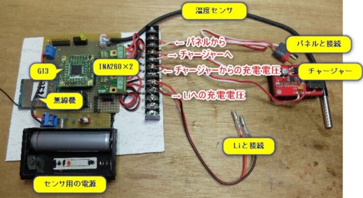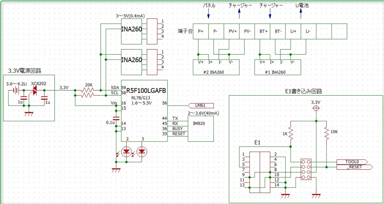 ※2019/9にアップした記事を加筆・訂正しました。 このセンサは、居宅から離れた畑の、陽当たりと気温(地温)を測るのに使っています。 ソースが必要であればコンタクトフォームから連絡してください。 センサ側はRL78(CS+)、PC側はC#で作っています。 元は↓こう言う目的でした。 「ソーラーパネルとリチウムバッテリーを使ったオフグリッド電源を作る必要があり、これの検証用に無線式のセンサを作りました。 屋外に設置したオフグリッド電源の電圧・電流・筐体温度などを計測して無線でPCに送信します。」 RL78G13+IM920+INA260+LM61の組合せです。 18650一本で3ヶ月ほど動作します。 ただ保存容量が足りないので、次に作るときはRAMの多いCPUを使いたいかも。 以下の3点を計測してPCに無線で送信します。 1,パネル → チャージャーへの電圧と電流値 2,チャージャー → Liへの電圧と電流値 3,筐体の内部温度
