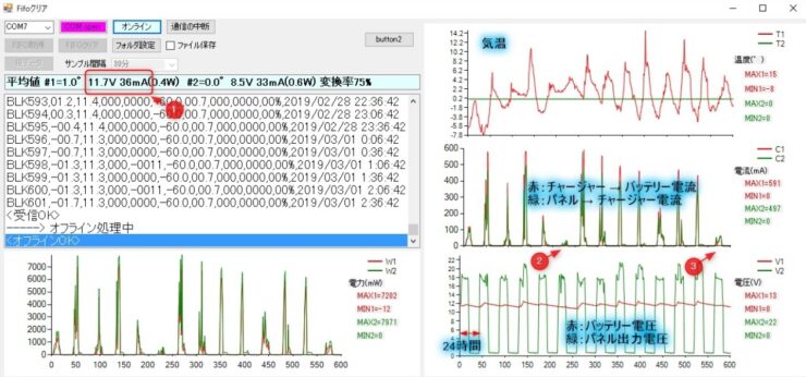 PC側のアプリは、センサへのコマンド送信とデータ受信&チャートへの表示だ。 特に難しいことはしてないけど、ソーラーシステムの検証には十分なんで良しって事で。 ①はチャージャー → Li間の電流で、二週間の平均で75%ほどの変換率。 ②③は雨の日だが数十mA程度は充電してる。