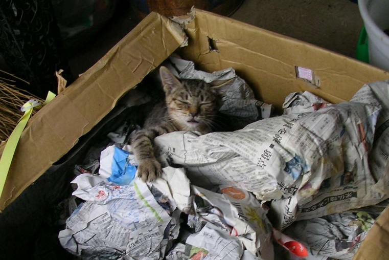 倉庫の中のゴミ箱で寝てた。