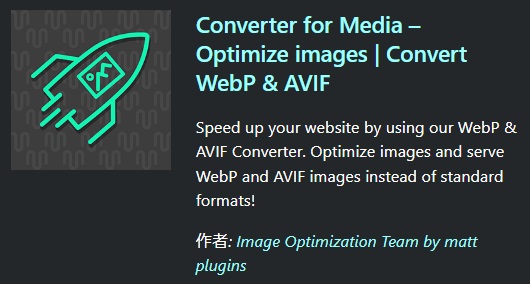 高速化のためのプラグイン「Converter for Media」をセットします。 画像形式をGoogleのWebP形式に自動変換してくれます。 画像によっては1/3~1/4ほどのサイズになるそうです。 ※この記事は最小の手間での設置法です。詳細を知りたい場合は検索を参照して下さい。 ※記事の画像はダークモードを使用しています(クリックで拡大)。