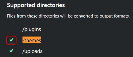 設定を変えるのは一カ所だけです。 ■ダッシュボード>設定>Converter for Media で設定ページを開き・・・ 1.Ctrl+Fで「/themes」を検索しチェック。 2.青色の「Save Changes」ボタンで保存。 変更点はこれだけです。