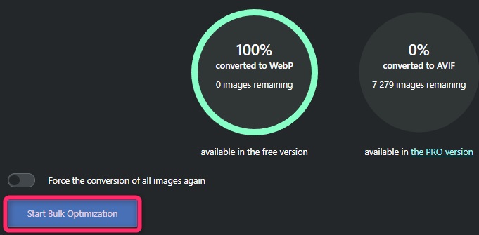 このプラグインを入れたら、既存の画像を全てWebPに変換してやります。 一度変換してしまえば、あとは画像のアップロード時に自動で変換してくれるので何もする必要はありません。 ※たまに自動変換しない場合があるので、週一ほどで100%であることを確認した方が良いようです。