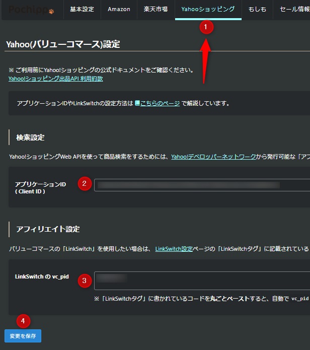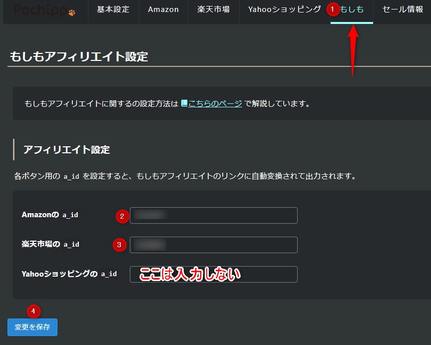 インストールが終わったらポチップ内にIDを設定しますが、先に全部のIDを取得してコピーしておきます。 ID番号のコピー方法はこちらも詳しいです。外部リンク もしもアフィリエイトから金IDを取得 公式リンク Amazonと楽天のIDを取得します(Yahooは不要) ■もしもログイン>プロモーション検索>提携中プロモーション>Amazonまたは楽天の「広告リンクへ」 と進み、ソース内のa_id=xxxxの数値部分をコピーします。 バリューコマースから金IDと検索IDを取得 公式リンク まず金IDを取得します。 ■バリューコマースログイン>ツール>LinkSwitch>LinkSwitch設定> と進み、vc_pid=xxxxの数値部分をコピーします。 続いて検索IDを取得します。 ■Yahooデベロッパーネットワークログイン>アプリケーションの管理> と進み、アプリケーション一覧内の作成したアプリケーション名(Hello, YConnect!など)をクリックしてClientIDをコピーします。 楽天から検索IDを取得 公式リンク 楽天からは検索用のIDのみ取得します(金IDは「もしもアフィリエイト」で取得済み)。 ■楽天のDevelopersログイン>画面上部右端の「アプリ情報の確認」 と進み、「アプリID/デベロッパーID」をコピーします。 AssistによるAmazonの広告リンク作成方法 公式リンク AmazonはポチップAssistを使うのでIDは不要です。 Amazonアソシエイトを使う場合は公式リンクを参照してください。