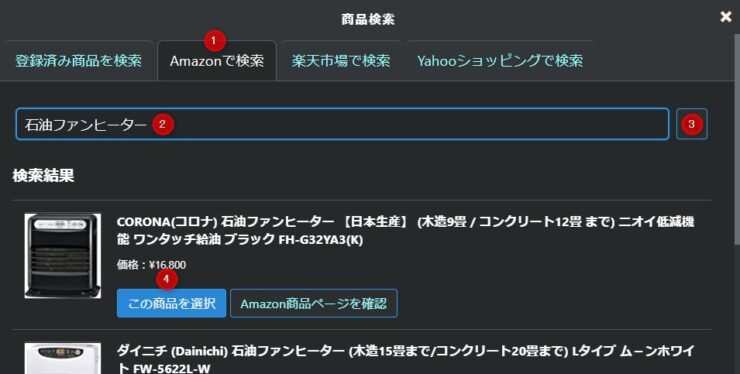 ①今回はAmazonで検索しましたが、楽天やYahooでも検索する場合に使います。