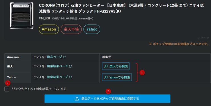 ※紹介したい商品の取り扱いが無い場合は、楽天やYahooで検索してみてください。 ※目的の1商品のみを表示させる場合は、Amazon・楽天・Yahooそれぞれで検索します。 ※扱う機会の多い商品はポチップ管理に登録しておくことができます。 詳細な使い方はこちらがとても分かりやすいです。 外部リンク