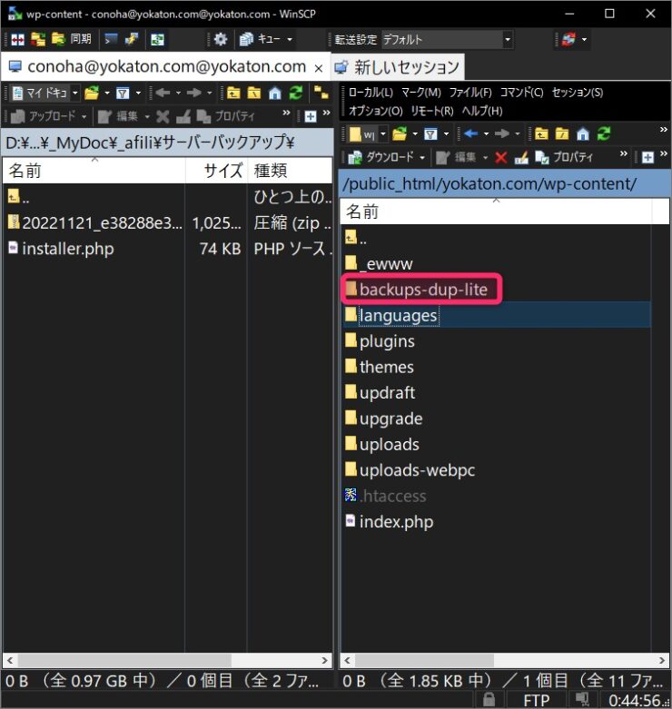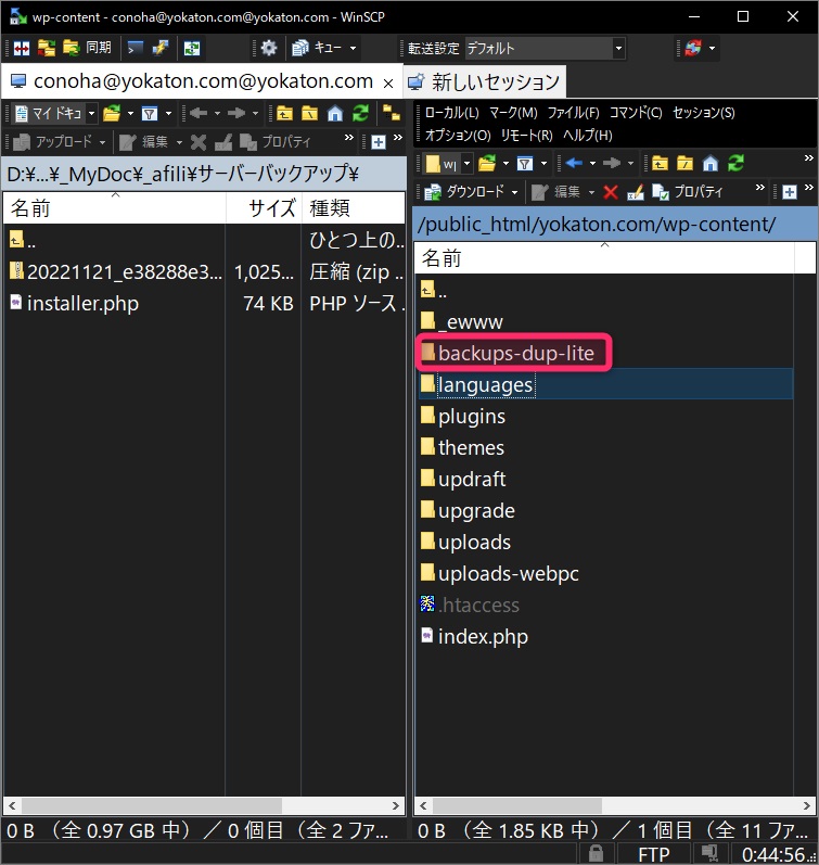 ZIPファイルが自分のPC内に転送(Download)されれば、サーバー上のZIPはもう不要です。 FTPなどでディレクトリ丸ごと削除してしまいましょう(ディレクトリ名は「backups-dup-lite」です)。
