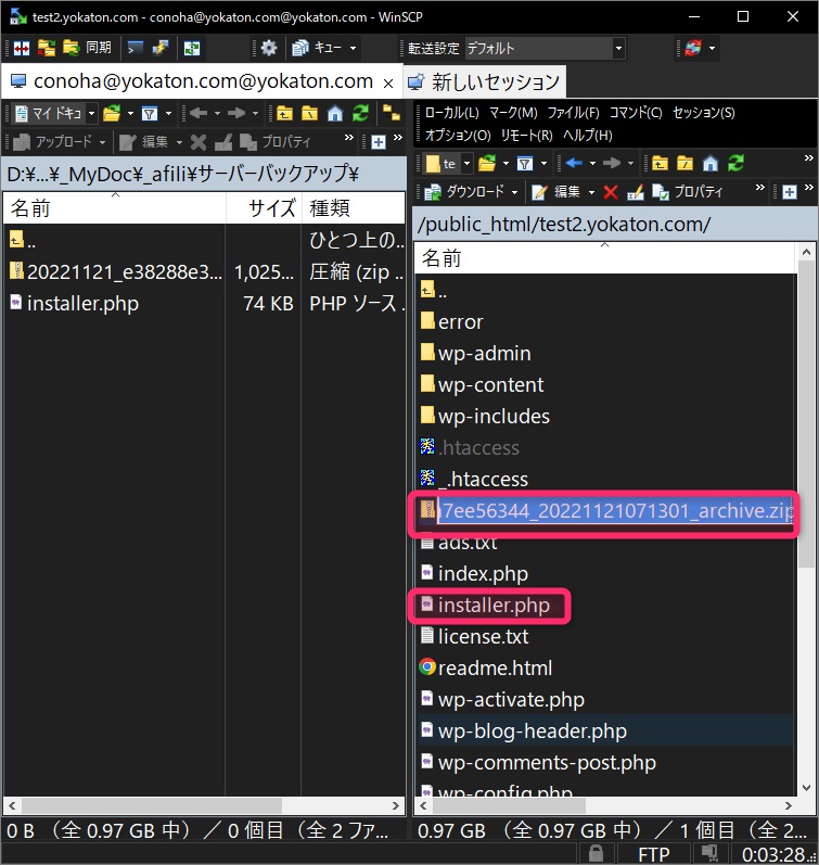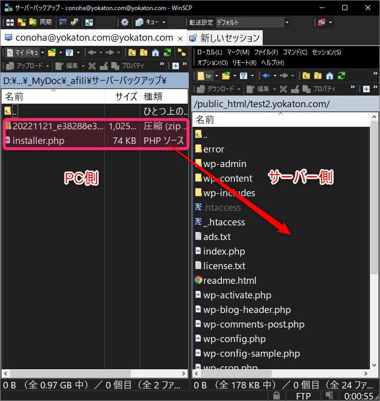 1. PC内に入ったこのZIPをFTPで引越先に転送し