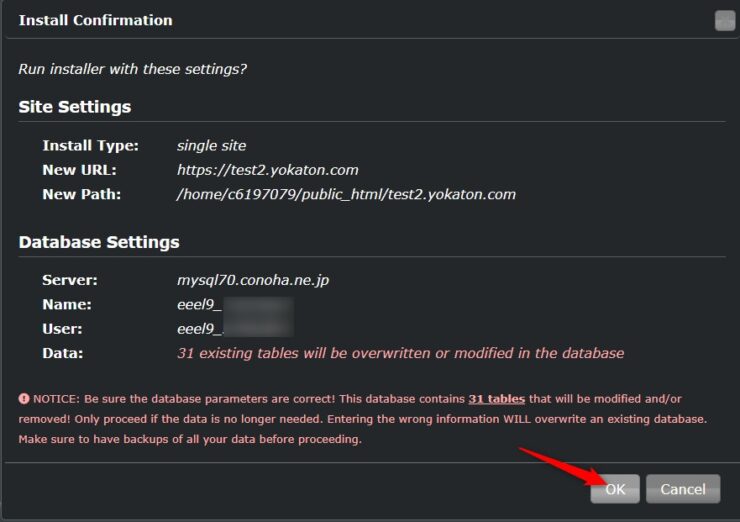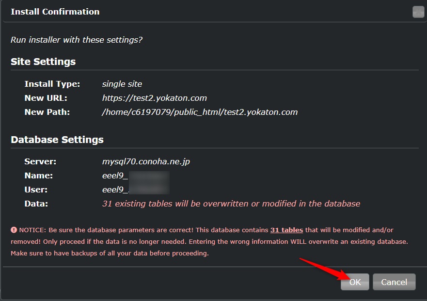 ここでOKをクリックするとWordPressとデータベースが全て書き換わります。