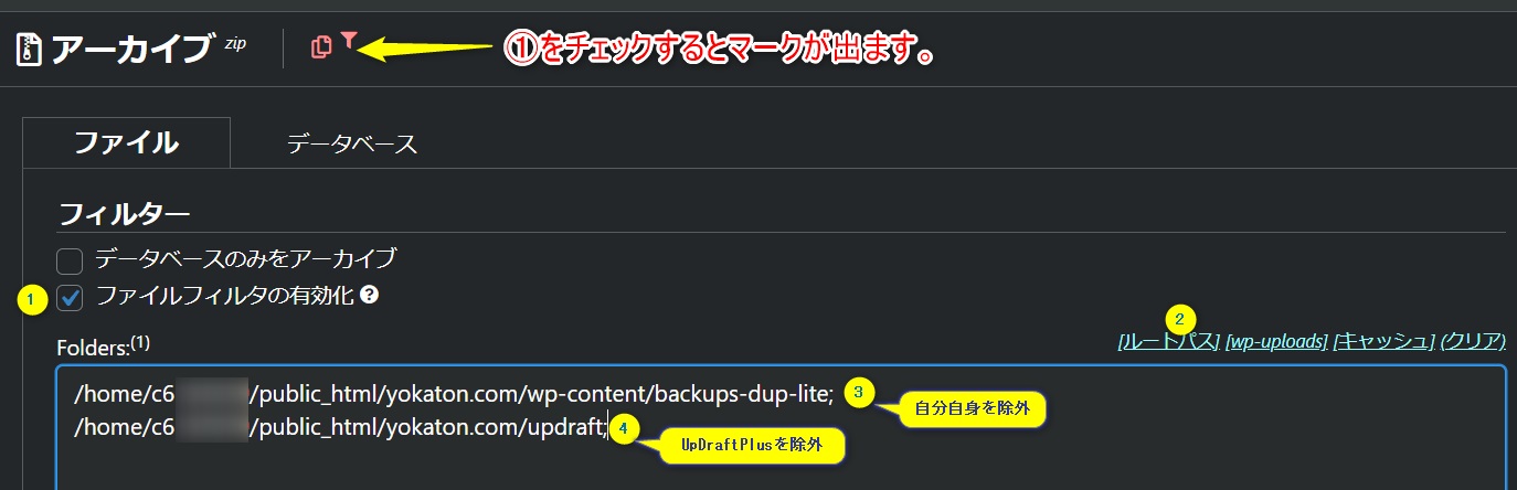 「ファイルフィルタの有効化」をチェックし、「/ルートパス/」をクリック、「/wp-content/backups-dup-lite;」を追記します。操作画像