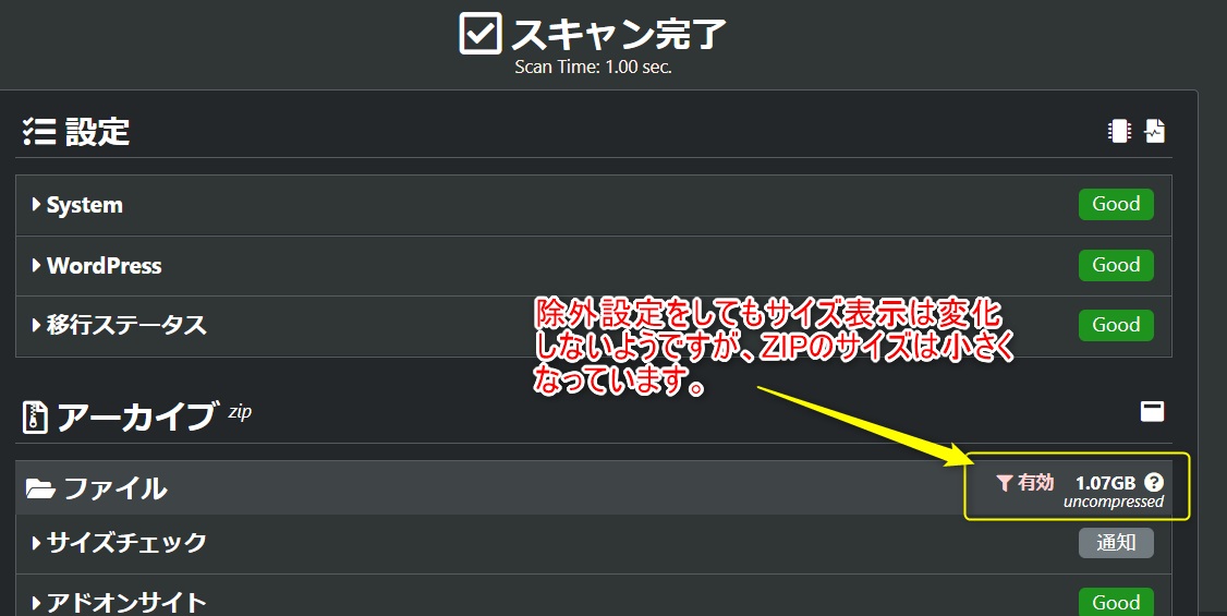 サーバー上の全ファイルをZIP化しないように、除外するファイルを指定します。
