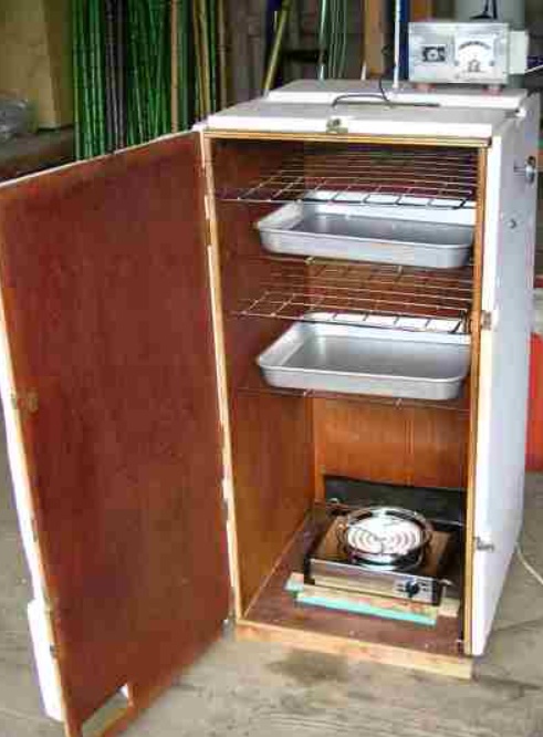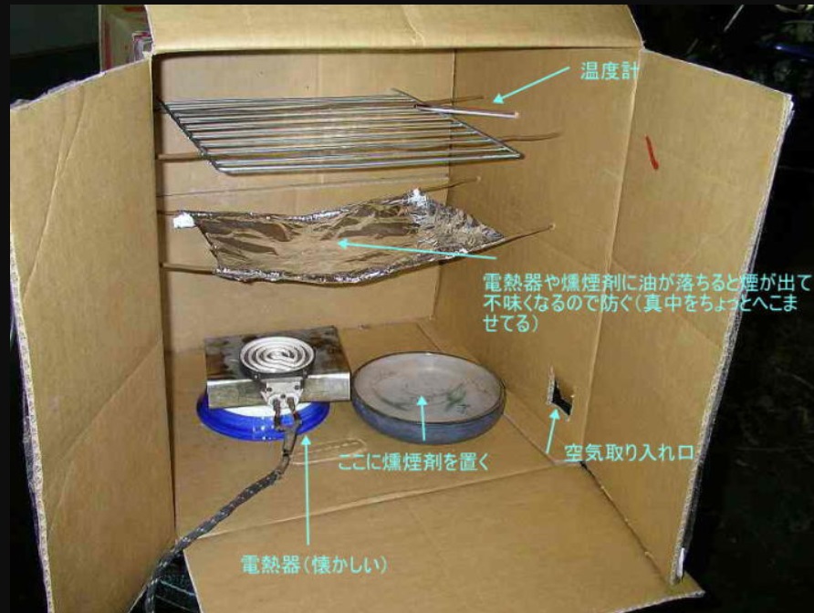 次の燻煙箱はダンボール箱、続いてベニヤ板の45cm角の箱でした。
