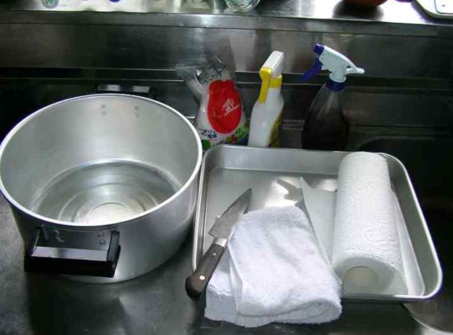 ナベ、バット、お盆、包丁、アルコール、ブランデー、塩、タオル、ペーパータオルなどです。