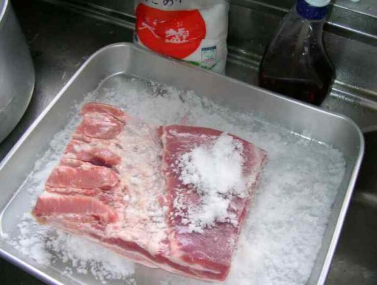 たっぷりの塩に漬けることで、肉の周りの菌を殺すとともに、血抜きもできます
