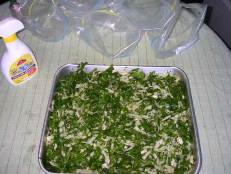 調味料をまぶし、袋に入れます(野菜の水分が多いときは、調味料を多めにします)。