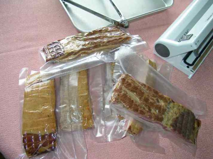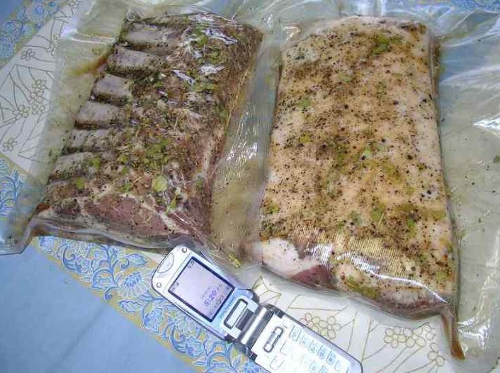 香料も強く効かせずに「肉の味」を味わいます。ベーコン用の肉はアメリカ産でもオーストラリア産でも良いけど、ハム用のロースだけは白金豚を使う方が良いです。