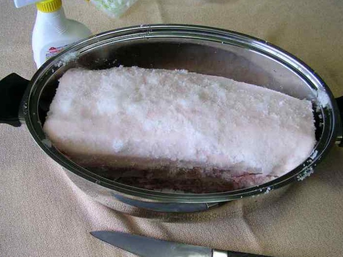 塩を濃くまぶして、4時間ほど冷蔵庫で寝かせます。
