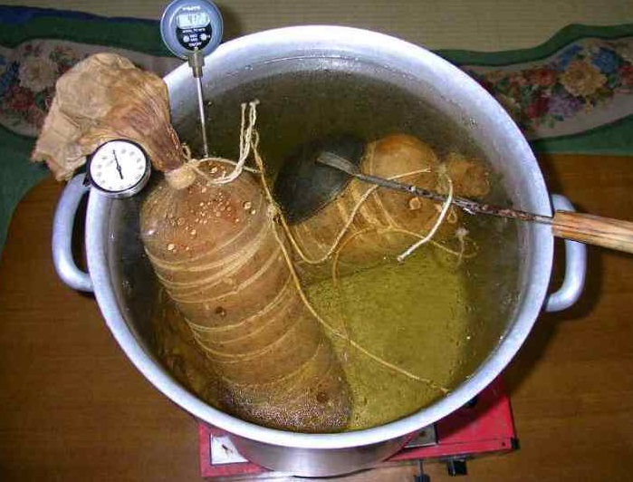 お湯と肉の中心に温度計を挿して、両者の温度差があまり開かないようにしてボイルします。こうすることで肉の表面と中心を同じようにボイルできます。