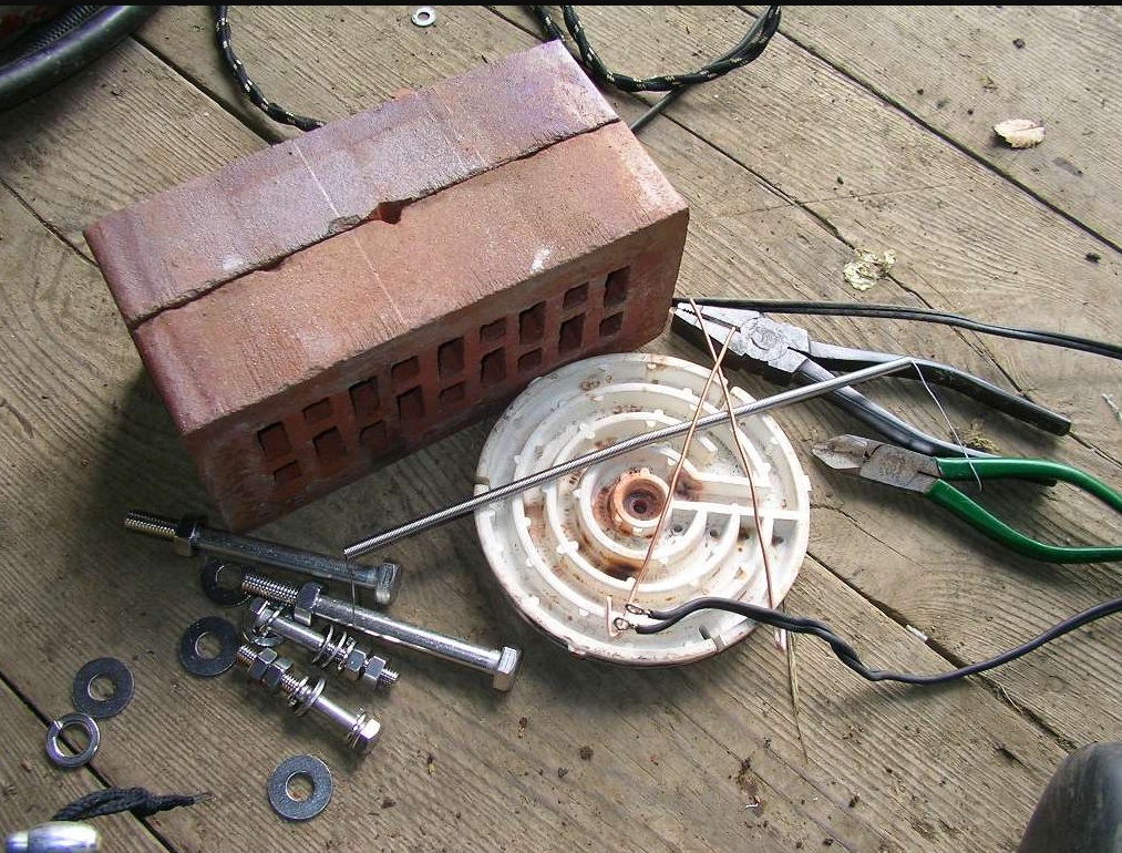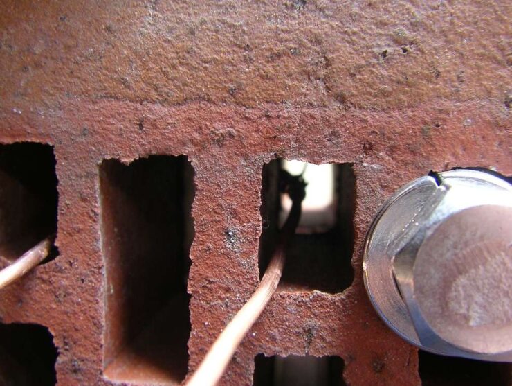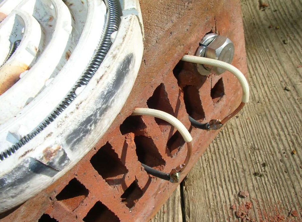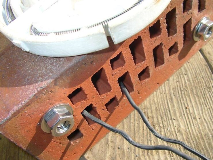 煉瓦の下の方の穴から電源線を通し、銅線にハンダ付けして反対側から引っ張る。